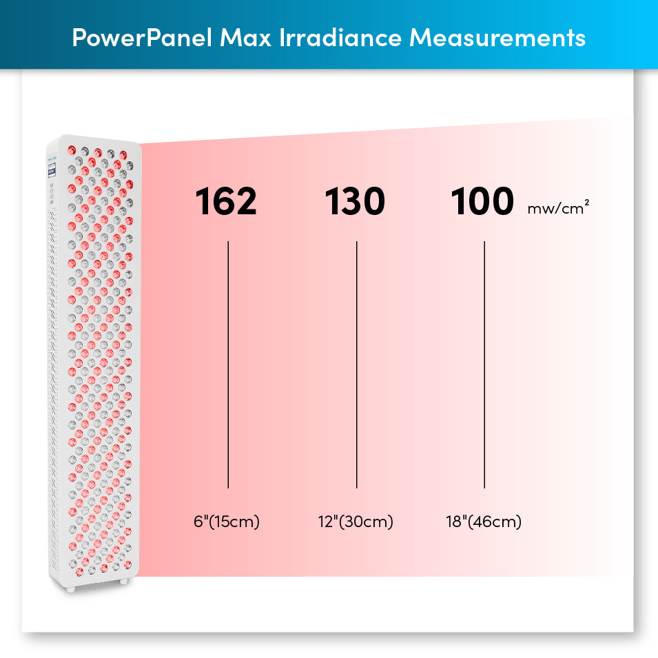 At a distance of 6 inches, the PowerPanel MAX delivers up to 162mW/cm² (measured using a solar meter) and maintains an average of 82mW/cm² at the same distance based on Light Spectrometer verified readings, ensuring consistent and effective light exposure for your wellness needs.